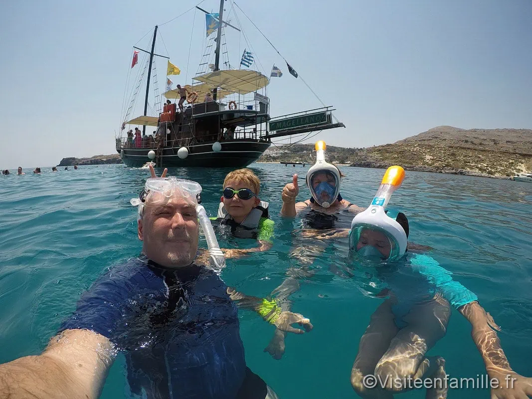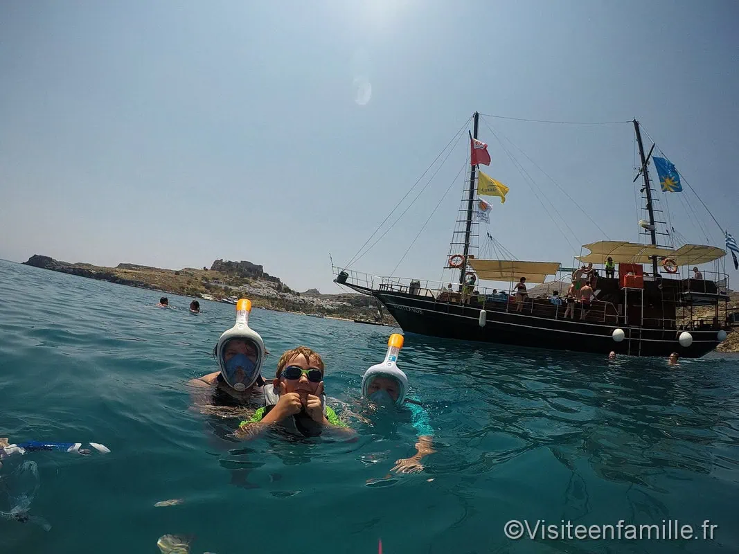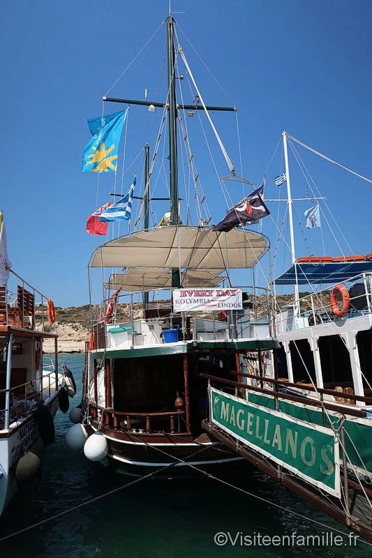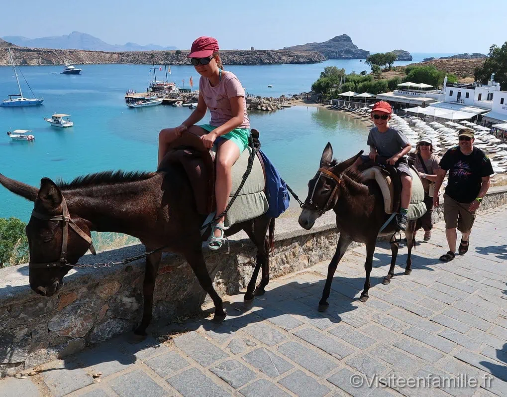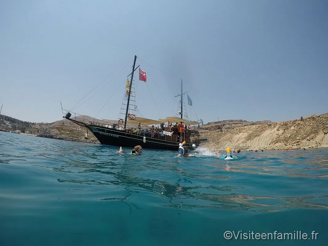Accueil Pays Grèce Rachel Cette excursion est sans aucun doute la plus belle que nous ayons faite. Bien sûr, tout est subjectif mais nous avons beaucoup apprécié la croisière entrecoupée de baignades dans une eau cristalline et la visite de l’acropole de Lindos même si la montée fût rude sous un soleil de plomb. Tout d’abord, réveil matinal pour un départ devant notre hôtel à 7h55 en bus (c’est quand même très tôt et dur dur pour les enfants). Arrivés au port de Kolymbia, nous embarquons à bord du bateau pirate le Magellanos. Petite chapelle de Kolymbia Pêcheurs Lindos Arrivée au port de Lindos vers 10h. Nous avons du temps libre jusque 12h45. Nous pouvons flâner dans les commerces, sur le port ou monter et visiter l’Acropole. Nous décidons de visiter l’Acropole. Au port, de nombreux ânes attendent les touristes. Nous décidons de louer deux ânes pour les enfants (8€ par enfants) et nous montons à pied. La montée se fait au pas de course, ce que nous regrettons. En effet, notre loueur était jeune et donc il pense ‘rentabilité’ : plus l’âne monte vite, plus il redescend vite pour reprendre d’autres clients. Nous sommes un peu déçus et nous, qui montions à pied, arrivons en haut dégoulinant de sueur et crevé. Pas super agréable car il faisait extrêmement chaud. D’autre part, nous avons été étonnés de voir des gens corpulents sur les ânes. Cela ne devrait être admis que pour les enfants. Pauvres ânes ! Il fait très très chaud en haut de l’Acropole et la visite est assez chère, 12€ par adulte et gratuit pour les enfants. Les ruines de l’Acropole La visite est intéressante et la vue d’en haut magnifique. Nous redescendons par les échoppes et les vendeurs de dentelles et de souvenirs en tout genre. Pendant la descente nous prenons le temps d’admirer le paysage, chose que nous n’avions pas pu faire lors de la montée. Il faut faire attention sur tout le site de Lindos car les pierres sont polies et glissantes. Voir aussiLe Luxembourg offre un bon d’achat pour une nuit dans un hôtel L’aller-retour vers l’acropole nous a donné soif et, arrivés au port, nous nous installons dans un bar pour boire un coup en attendant l’heure du départ du bateau. Croisière Pour le 1er arrêt baignade, nous n’allons pas très loin puisque le bateau jette l’ancre dans la baie de Lindos. Après avoir récupéré un gilet de sauvetage pour Jérémy, nous nous jetons tous à l’eau. En effet, pour les personnes ne sachant pas très bien nager, il vaut mieux utiliser un gilet de sauvetage ou des frites (prêtés par le capitaine) car nous n’avons pas pied. De retour sur le bateau pour 50 minutes. Le capitaine donne à tout le monde un bout de pastèque et met de la bonne musique des années 2000. Ambiance assurée à bord et le temps passe agréablement. Puis 2ème arrêt baignade : Puis 3ème et dernière baignade à Tsambika bay. Magnifique. Et happy hour sur les cocktails au bar du bateau. Retour au port de Kolymbia à 16h et arrivée à l’hôtel a 16h30.