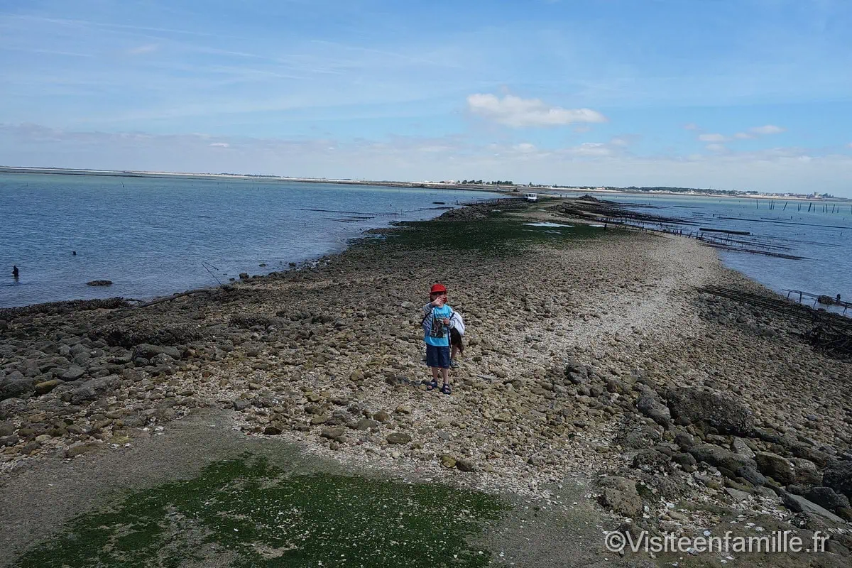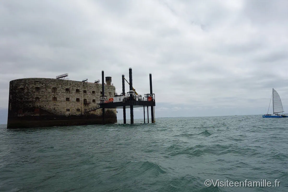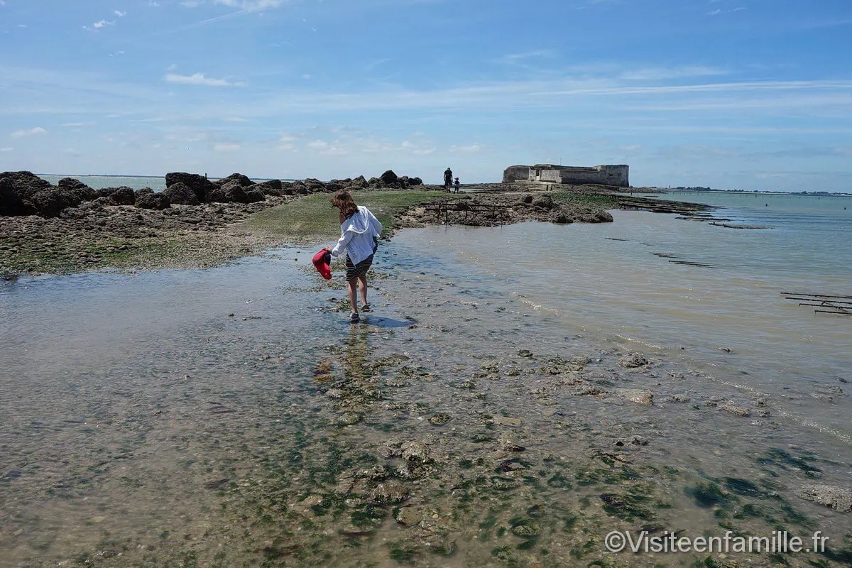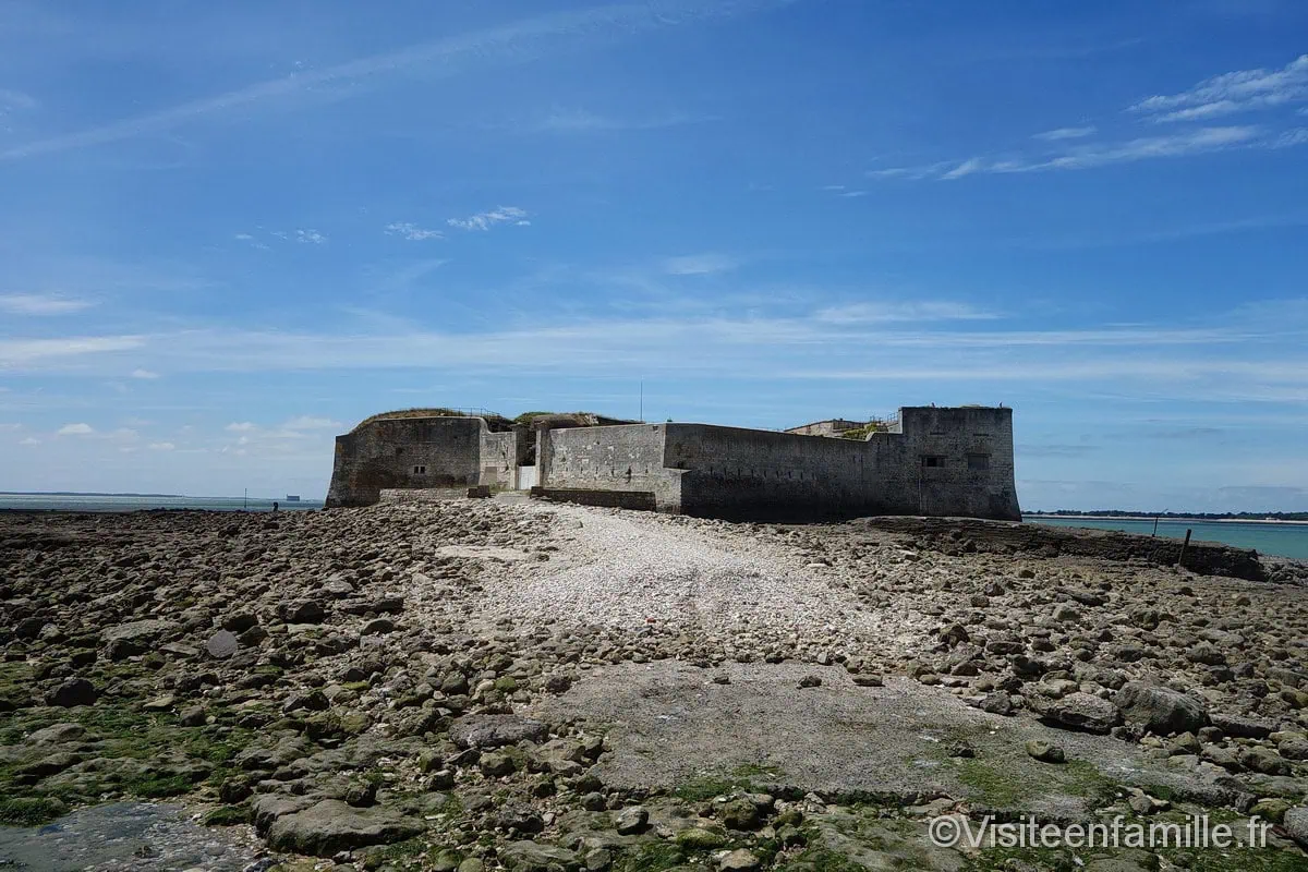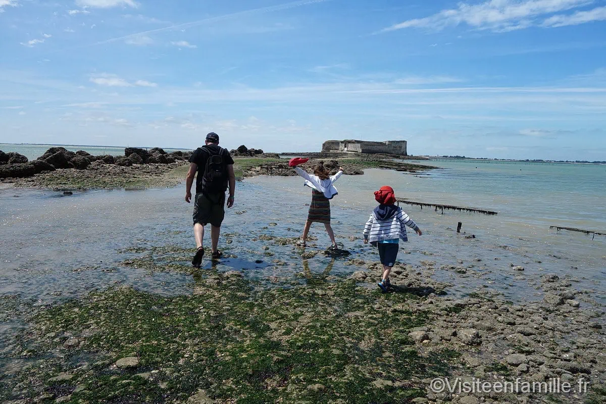 Accueil Pays France Rachel Pour aller voir le célèbre Fort Boyard, il faut se rendre à Fouras. Fort Boyard était une étape incontournable de notre séjour en Charente-Maritime. Les enfants nous ont ‘obligés’ d’y aller. Ils espéraient sans doute voir le père Fouras en haut de sa tour ou voir Passe-Temps et Passe-Partout courir à travers le fort. SommaireFort Enet à marée hauteFort BoyardFort Enet Notre vidéo d’une visite près de Fort Boyard A Fouras, il est possible de prendre le bateau pour se rapprocher de Fort Boyard (en effet, on ne peut pas accoster sur le fort) ou de prendre le traversier pour aller sur l’île d’Aix. Il y a un parking payant tout près du port mais pour ceux qui ne veulent pas engraisser les machines à fric et qui n’ont pas peur de marcher un peu, un autre parking se trouve à environ 15 minutes à pied. Cela nous convient très bien (parking dont une partie est payante et réservée aux cars et camping-cars et une autre partie gratuite réservée aux voitures). Un bon plan pour ceux qui, comme nous, préfèrent garder leurs sous pour une bonne glace par exemple 🙂 Du port, on peut prendre la navette qui relie en 20 minutes le continent à l’île d’Aix. Ile d’Aix Malheureusement faute de temps et de concessions, nous n’avons pas pu mettre le pied sur cette île. Nous avons préféré, pour les enfants, prendre le bateau qui fait le tour de Fort Boyard. Personnellement j’aurais voulu aller sur l’île d’Aix et me promener un peu sur cette île mais la majorité, qui a préféré faire un tour en bateau pour voir Fort Boyard de près, l’a emporté. On embarque donc à bord de l’Hippocampe pour se rapprocher au plus près de Fort Boyard. Le bateau passe tout d’abord devant le Fort Enet. A marée haute, il est impossible de se rendre à pied à Fort Enet. Nous décidons d’y aller à notre retour, lorsque la marée descendra. Fort Enet à marée haute On passe devant ce Fort entouré par les eaux, puis on se rapproche vraiment près de Fort Boyard donc les enfants, qui connaissent bien l’émission télé, sont ravis. Ils tentent d’ailleurs d’apercevoir le père Fouras qui doit certainement se trouver au sommet de sa tour. Fort Boyard Peine perdue car malheureusement ils ne l’ont pas vu. Une ballade sympa à faire pour 50€ pour nous 4. Le prix du billet adulte est de 14€. Nous nous approchons assez près du Fort et nous en faisons le tour. Nous voyons ainsi l’arrière du Fort (que l’on ne voit jamais dans l’émission du même nom à la télé) sur lequel on voit des plateformes. Et à l’approche du fort, le capitaine du bateau nous donne des explications sur la naissance de ce Fort et nous met dans l’ambiance en nous mettant la musique du jeu télévisé. Visite intéressante qui a plu aux enfants pour 2 raisons : – Ils ont fait du bateauVoir aussiVisite Foire Internationale de Metz 2023 – FIM 2023 – Ils ont vu Fort Boyard, le même qu’à la télé Notre fils nous a demandé de faire un anniversaire Fort boyard à la suite de cette visite :). Fort Enet Lorsque notre tour en bateau fût terminé, la marée étant descendante, nous avons entrepris la traversée à pied vers le fort Enet. Ce fort privé peut se visiter a priori sur réservation et uniquement à marée basse. Nous n’avons pas pu le visiter mais la traversée à travers le parc ostréicole est longue mais intéressante. On marche sur un chemin de coquillages et les enfants à la recherche de beaux coquillages sont ravis. Il nous a été donné l’occasion de voir une belle étoile de mer. Derrière le fort Enet se dresse au loin le majestueux fort Boyard. clip clap ploutch les pieds dans l’eau…. En route pour l’aventure moussaillons … Le paysage est magnifique. Notre vidéo d’une visite près de Fort Boyard