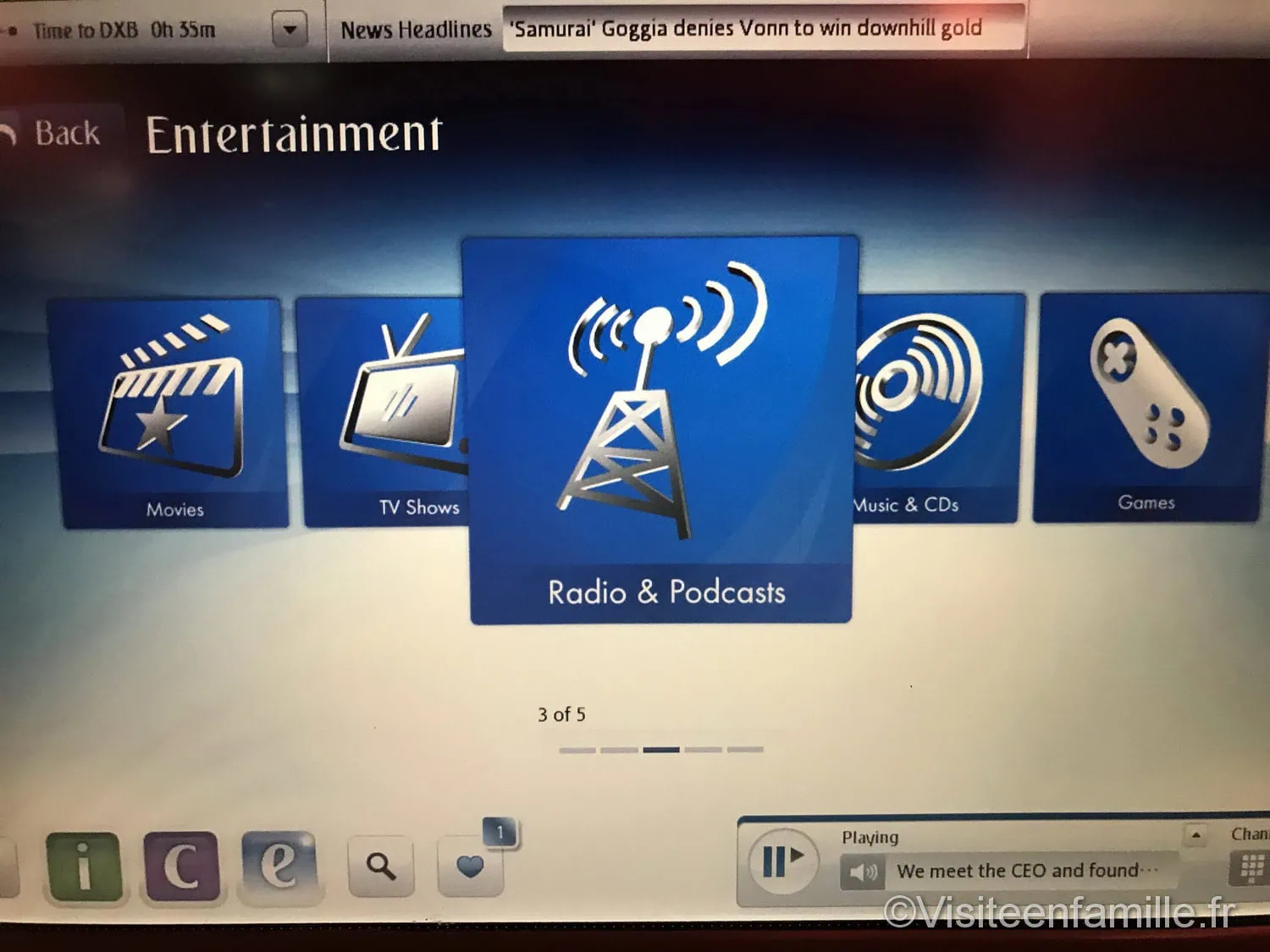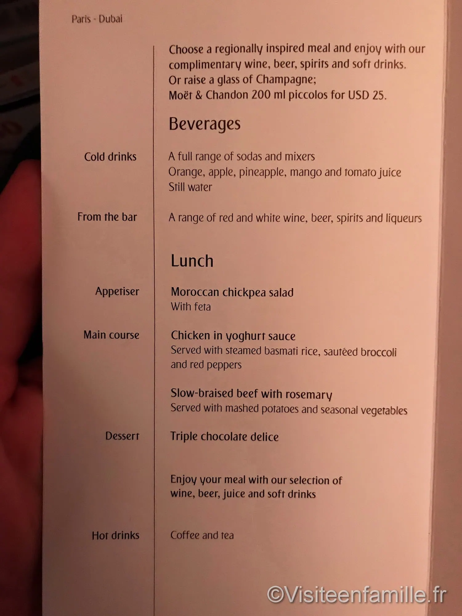 Accueil Pays Dubaï Rachel Cette année nous avons décidé de passer nos vacances d’hiver au soleil. Marre du froid, de la neige et de la pluie, nous recherchions le soleil et le ciel bleu. Destination : Dubaï en Février !! Pour nous y rendre, notre choix s’est porté sur la compagnie Emirates. SommairePourquoi réserver ses places avant le décollage ?Les valises dans un avion EmiratesLe check-in en ligne avant le départL’avion EmiratesLes films et jeux vidéo dans un avion EmiratesVidéo de l’interface des films et jeux EmiratesEmirates pour les enfantsLe repas à bord d’Emirates Nous avons réservé nos billets classe économique pour Dubaï (en vol direct de jour) via internet directement sur le site de Emirates : billet aller-retour Paris CDG-Dubaï. Le choix du vol direct s’impose généralement lorsque vous voyagez avec des enfants. Nous avions le choix entre le vol de jour (départ 10h00- arrivée 19h30) ou le vol de nuit (avec une arrivée vers les 2h du matin). Le vol de nuit peut être moins cher mais lorsqu’on voyage avec des enfants il est préférable de voyager de jour pour éviter une trop grande fatigue à l’arrivée. Pourquoi réserver ses places avant le décollage ? Il faut savoir que lorsque l’on réserve, les sièges ne sont pas attribués et le choix du placement dans l’avion est payant en supplément si l’on préfère réserver à l’avance mais gratuit si vous attendez les deux derniers jours avant votre départ ; le risque étant de vous retrouver séparés. Comme nous voyageons à 4 avec deux enfants, nous avons préféré réserver nos places à l’avance et donc de payer un supplément. Nous choisissons de nous placer à l’avant de l’avion (places plus chères car meilleure vue et nous ne sommes pas sur les ailes) : 3 places côte à côte côté hublot et une place de l’autre côté du couloir. Les valises dans un avion Emirates Chaque personne peut avoir une valise de 30 kg et un bagage à main de 7 kg maximum. Le check-in en ligne avant le départ Deux jours avant le départ vous recevez un mail et vous avez le choix de choisir vos places si ce n’est pas encore fait et de pouvoir faire le check-in online. C’est ce que nous avons fait pensant gagner du temps lors de l’enregistrement à Paris mais la queue pour ceux qui ont fait le check-in online comme nous était 10 fois plus grande que celle pour ceux qui ne l’avaient pas fait et au final cela ne sert pas à grand chose. Pour le retour nous ne l’avons pas fait et comme nous étions tôt à l’aéroport nous n’avons pas fait la queue du tout. L’avion Emirates Nous montons à bord d’un Airbus A380. Les places sont assez confortables et un oreiller, une couverture ainsi qu’un casque audio sont placés sur chaque siège. Les films et jeux vidéo dans un avion Emirates Chacun a son propre écran et des milliers de films sont disponibles dont certains très récents dans plusieurs langues au choix. Il y avait ainsi toute une catégorie de Marvel, des dessins animés Disney et une sélection de films récents (le crime de l’Orient express, Paddington 2, Blade runner, Mother, Thor Ragnarok…). Ainsi chacun de nous a pu tranquillement choisir ses films en fonction de ses goûts. On peut également écouter la radio, jouer à des jeux. N’hésitez pas à consulter le site officiel d’Emirates afin de connaitre les films et jeux qui seront disponibles dans votre avion : https://www.emirates.com/fr/french/experience/woyf/ Nous vous avons fait d’ailleurs une petite vidéo pour vous présenter l’interface des films et jeux vidéos que nous avons eu en février 2018. Vidéo de l’interface des films et jeux Emirates Emirates pour les enfants A l’aller, les enfants ont reçu en cadeau de la part d’Emirates un sac isotherme à goûter rouge avec des petits jeux et un bandeau pour mettre sur les yeux pour dormir tranquillement. Cadeaux Emirates pour les enfants Pour le retour, ils ont reçu un sac violet avec plusieurs livrets de jeux, des petits stylos pour colorier, un bandeau pour mettre sur les yeux. Cadeaux Emirates pour les enfants Ces petites attentions données aux enfants par Emirates font plaisir. Au retour, ils ont même pu se déguiser en commandant et hôtesse de l’air et faire une photo-souvenir. Le repas à bord d’Emirates Concernant les repas à bord, ils sont très corrects. On vous distribue au départ un menu et vous avez le choix entre 2 plats (bœuf et poulet par exemple). On vous sert tout d’abord l’apéritif avec des petits gâteaux apéritifs aux herbes (les enfants les ont adorés). Voici le menu que nous avions eu à l’aller. Les enfants ont leur propre menu et sont servis avant. Bon en général, ils ne mangent pas grand-chose mais c’est pourtant très correct. Au retour, ils ont même eu droit à une glace en guise de goûter reçu quelque peu avant l’atterrissage. En conclusion, nous repartirons sans aucun doute avec la société Emirates. Notre vol de 6h40 s’est déroulé dans de bonnes conditions que ce soit à l’aller ou au retour. Comme on s’occupe, le temps passe vite. Nous avons apprécié les cadeaux donnés aux enfants, les repas servis à bord et l’écran personnel. Les écouteurs sont très corrects mais si vous souhaitez prendre vos propres écouteurs qui atténuent les bruits c’est tout à fait possible mais il faudra vous munir d’une prise adaptée.Voir aussiImmersion avec les raies et les requins à l’Atlantis de Dubai Départ de Dubaï Notre avion enfin prêt pour le départ Quelques images vues d’avion : Arrivée à Paris La Tour Eiffel vue du ciel Les terres sont gelées