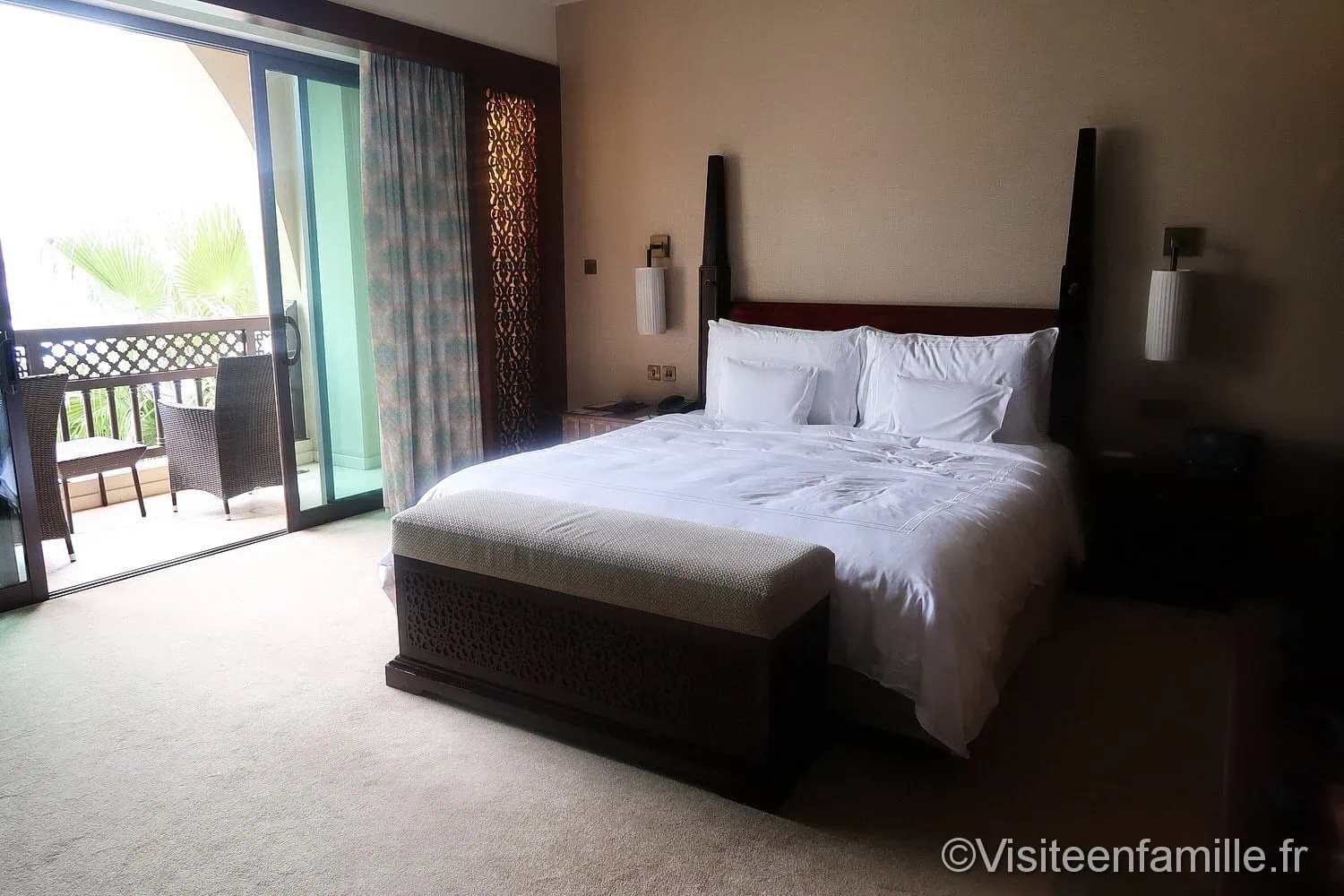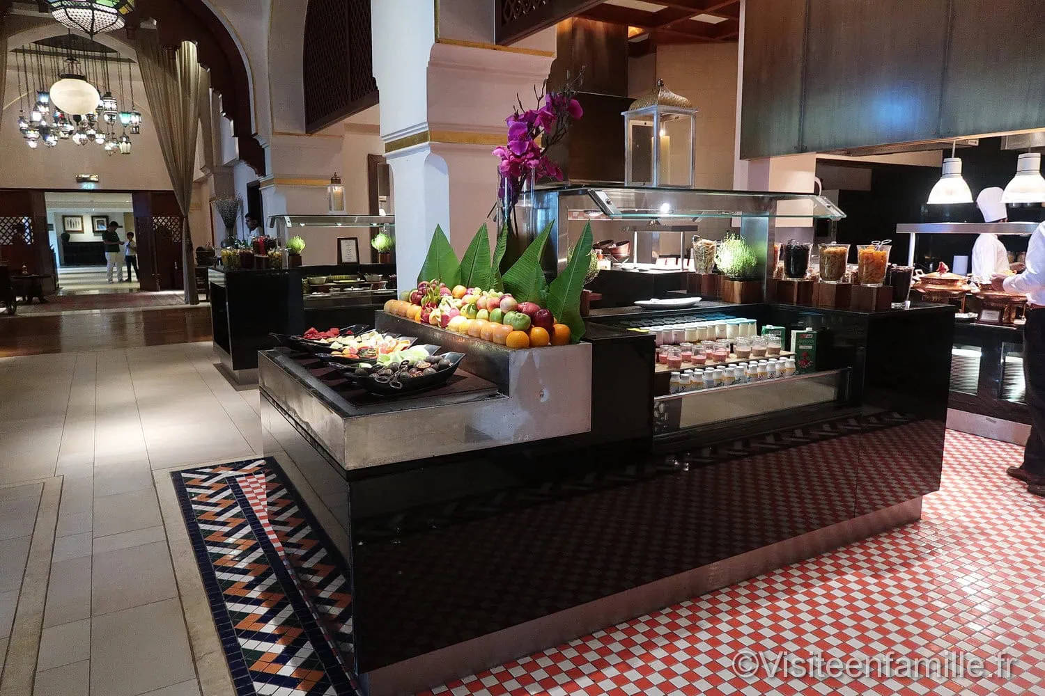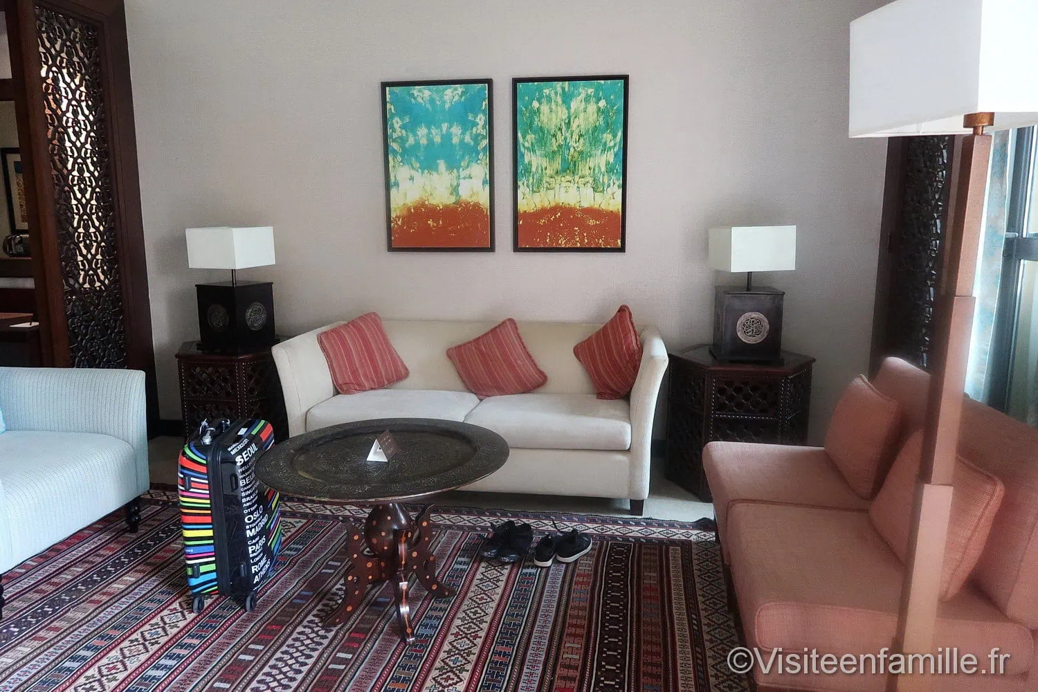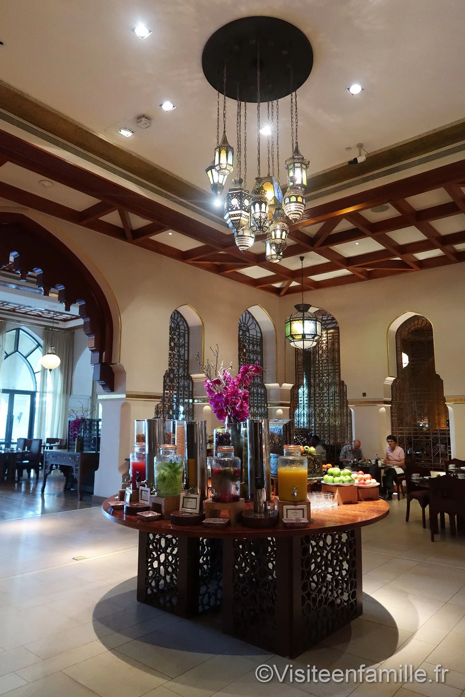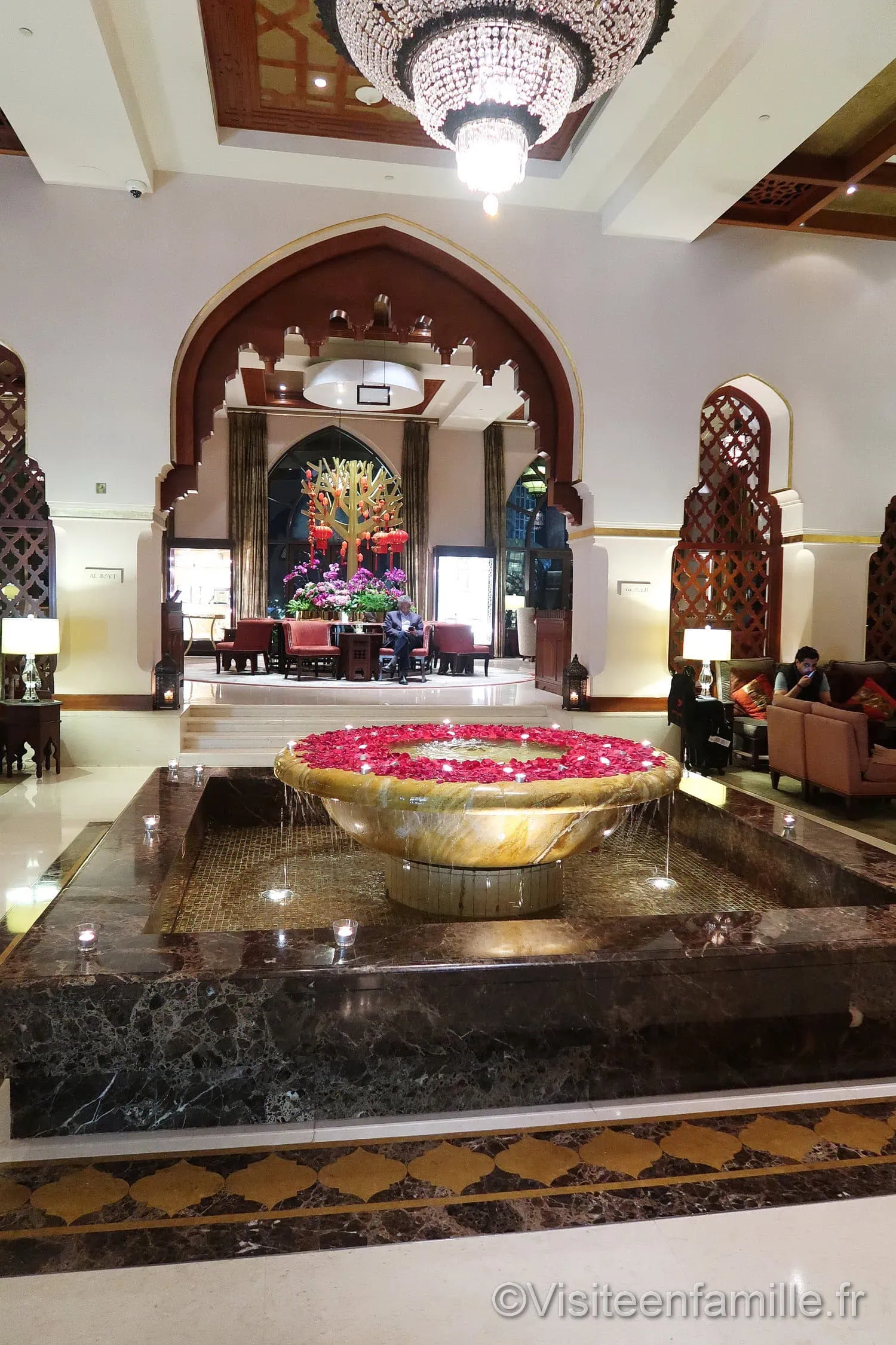 L’intérieur de l’hôtel est raffiné dans le style arabe avec une petite fontaine dans le hall d’entrée. Bien sûr là nous sommes vraiment très loin du style de l’Atlantis. Ici nous avons un style plus épuré, plus délicat, moins tape à l’œil. Mais finalement, nous aimons le tape à l’œil surtout pour les enfants. L’hôtel comprend beaucoup moins de chambres qu’à l’Atlantis the palm. On est dans une ambiance plus intimiste.