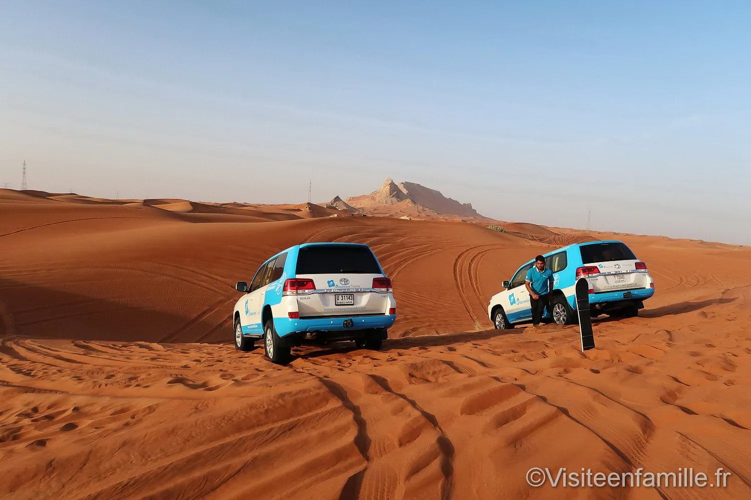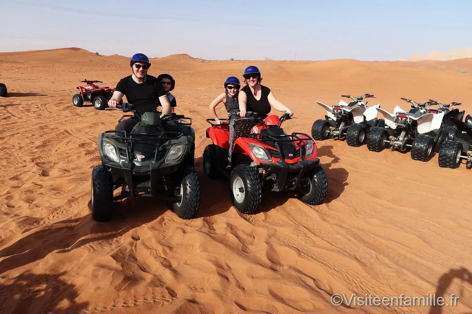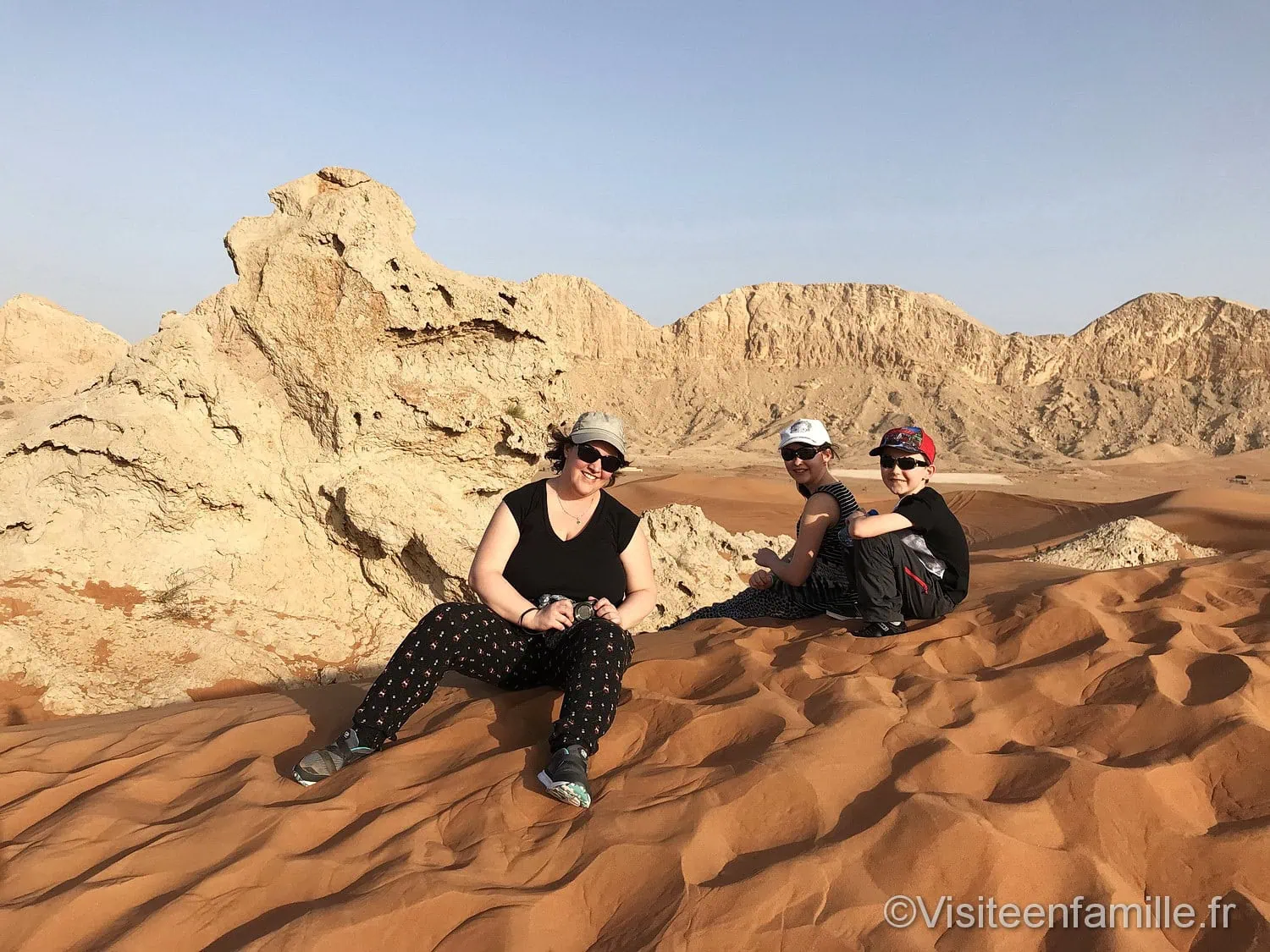 Accueil Pays Dubaï Rachel Safari dans le désert de Dubaï jusqu’à Camel rock et Fossil rock SommaireSafari dans le désert de Dubaï jusqu’à Camel rock et Fossil rockTour en quad dans le désertSafari en 4*4Camel rockSandboardFossil rockTour en chameauRepas et spectacleNotre vidéo de notre journée Fossil and camel rocks extreme safari Nous avons fait cette excursion extrême en 4*4 dans le désert avec deux enfants (11 et 7 ans). C’était génial. Notre chauffeur Ash de la société OceanAir travels est un très bon pilote dans les dunes du désert. De nombreux commentaires sur Tripadvisor le recommandaient et effectivement il est très bon. D’ailleurs vous pourrez voir notre vidéo en fin d’article. Il est venu nous chercher à notre hôtel, l’Atlantis, vers 14h et nous sommes partis au centre-ville chercher deux autres personnes. Nous étions donc un petit groupe de 6 personnes dans la voiture. Nous avons opté pour cette excursion justement parce que nous sommes peu nombreux. Dans les dunes, nous n’étions que 2 voitures de la même société ce qui est très peu. Plusieurs temps forts ont rythmé notre après-midi. Tour en quad dans le désert Après 30 à 40 minutes de voiture depuis l’Atlantis, nous arrivons à notre 1er stop où il nous est possible de faire du quad dans le désert. Nous avons donc loué deux quads pour 400 dirhams (200 par quad pour 2 personnes) (non compris dans l’excursion) et nous avons arpenté les dunes. On est loin des petits tours tranquilles que l’on fait en France sur des quads avec des enfants. Ici, c’était des grandes descentes et des montées qui étaient tellement raides que l’on aurait pu croire qu’elles étaient à 90 degrés. C’était très impressionnant et surtout amusant une fois que l’on commence à maitriser le quad. Nous avons eu de la chance car nous avons eu un guide sans qui nous n’aurions pas tenté des montées aussi abruptes. C’était un moment très fort en émotion. Safari en 4*4 Puis après avoir dégonflé les pneus, nous nous dirigeons vers les dunes et là le rodéo en voiture commence. C’est impressionnant de faire du dune bashing (terme utilisé par notre guide). Notre voiture semble tomber, on a du sable sur toutes les fenêtres. C’était super. Nous avons passé un moment inoubliable et très remuant. Cela fait même peur au départ puis ensuite on y prend goût et on en redemande. Même les enfants ont adoré. Le guide nous avait juste signaler avant de commencer que si on se sentait mal, il fallait lui signaler afin que l’on puisse s’arrêter. Même notre vidéo que vous retrouverez en fin d’article n’arrive pas à traduire les effets spectaculaires que l’on peut ressentir pendant ces descentes ou montées. Quelques fois, on se retrouvait sur la crête de la dune et on se demandait si le véhicule n’allait pas chuter à gauche ou à droite. Notre chauffeur avait une maitrise parfaite du véhicule et je peux dire que c’est rassurant. Camel rock Après 20 à 30 minutes de rodéo, on s’arrête pour le 2ème stop à Camel rock : pause photo devant le chameau de pierre. Le nom de cet endroit provient du relief en forme de chameau des montagnes. On saute pour faire des effets avec le sable. Sandboard On est repartis pour de nouveau s’arrêter pour une petite pause détente. On nous propose de faire du sandboard. Le sandboard c’est comme le snowboard sauf que la neige est remplacée par du sable. Pas facile de tenir sur cette planche mais les enfants ont bien aimé. Le hic c’est qu’une fois qu’on a descendu la dune, il faut la remonter. Il y a deux techniques pour faire du sandboard : soit sur ses jambes en étant accroupis soit assis sur la planche Chacun sa technique !!Voir aussiGolden circle and Secret Lagoon Fossil rock Nous repartons pour nous arrêter un peu plus loin à Fossil rock. Ash nous explique (en anglais) qu’il y a très longtemps le désert était recouvert par les eaux et des fossiles se sont créés dans la roche. Il a mouillé la pierre avec de l’eau et quelques beaux fossiles sont apparus. Le soleil commençait à descendre et après quelques photos, nous sommes repartis pour sortir du désert. Après regonflage des pneus nous avons pris une route pour nous diriger vers le ‘restaurant’. Il y avait énormément de voitures, signe qu’il y avait déjà du monde à l’intérieur. Tour en chameau Quelques chameaux nous attendaient devant. Nous sommes montés à 2 par chameau et fait un petit tour (vraiment petit, qui a duré 1 minute à peine). Dommage que ce tour en chameau n’ait pas été plus long mais c’est une activité purement pour les touristes. Attention au démarrage et à l’atterrissage, il faut bien s’accrocher ! Repas et spectacle Ensuite on s’est dirigés à l’intérieur où notre guide nous a accompagnés à une table. Après avoir mangé une datte, une pâtisserie, et bu un verre de thé qu’on nous propose, le repas sous forme de buffet était servi. Il y avait de tout et on pouvait manger largement à sa faim. Un spectacle de 2 danses nous a été proposé. Il s’agissait de : Tanura dance show et le Belly dance show. Le belly dancing correspond à la danse du ventre. Il était possible aussi de se faire tatouer les mains au henné, fumer la chicha, porter un aigle ou encore revêtir une djellaba. Nous sommes revenus à notre hôtel sous les coups de 21h. Une bonne après-midi qui nous a bien fatigués. Notre vidéo de notre journée Fossil and camel rocks extreme safari