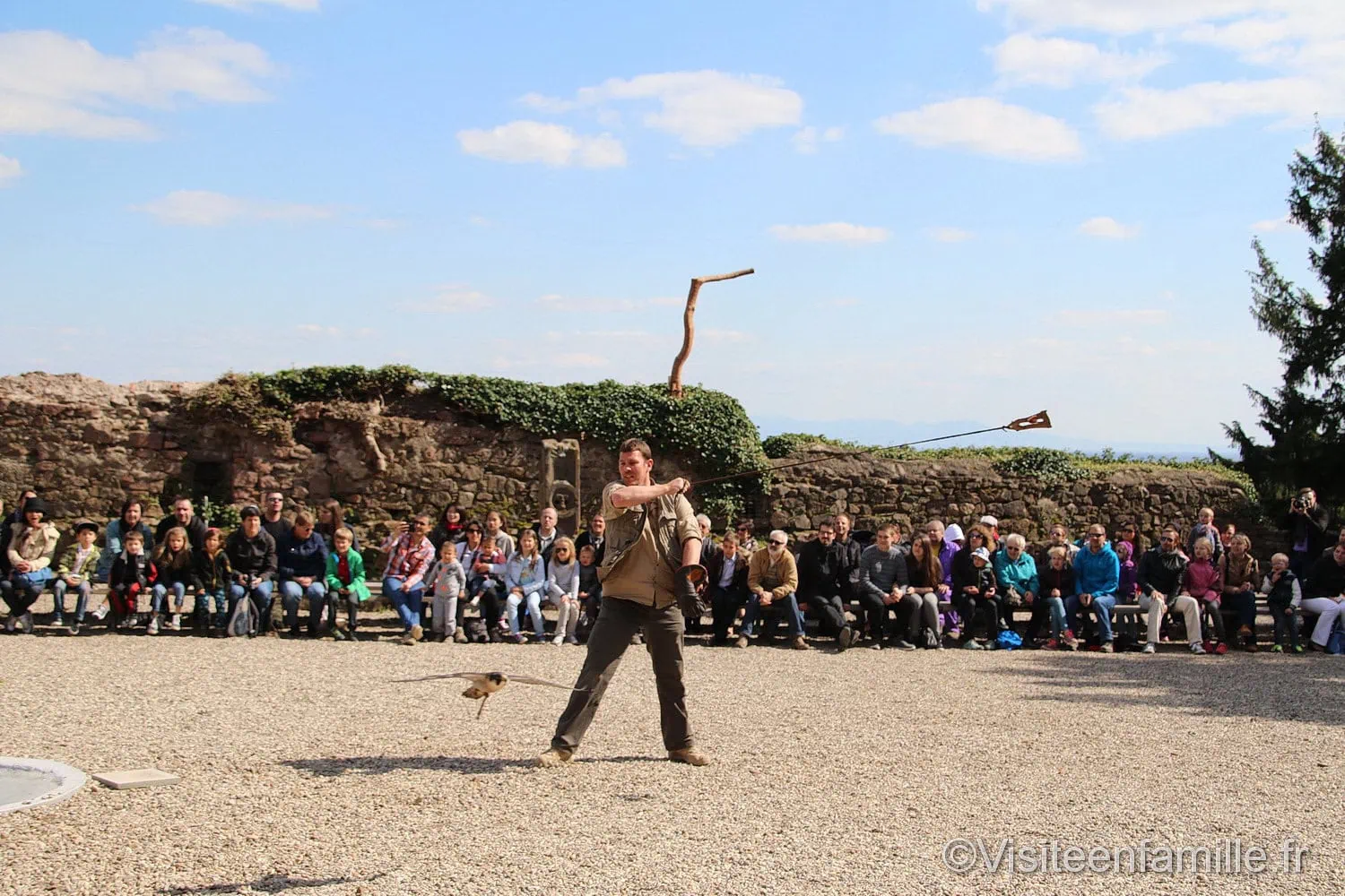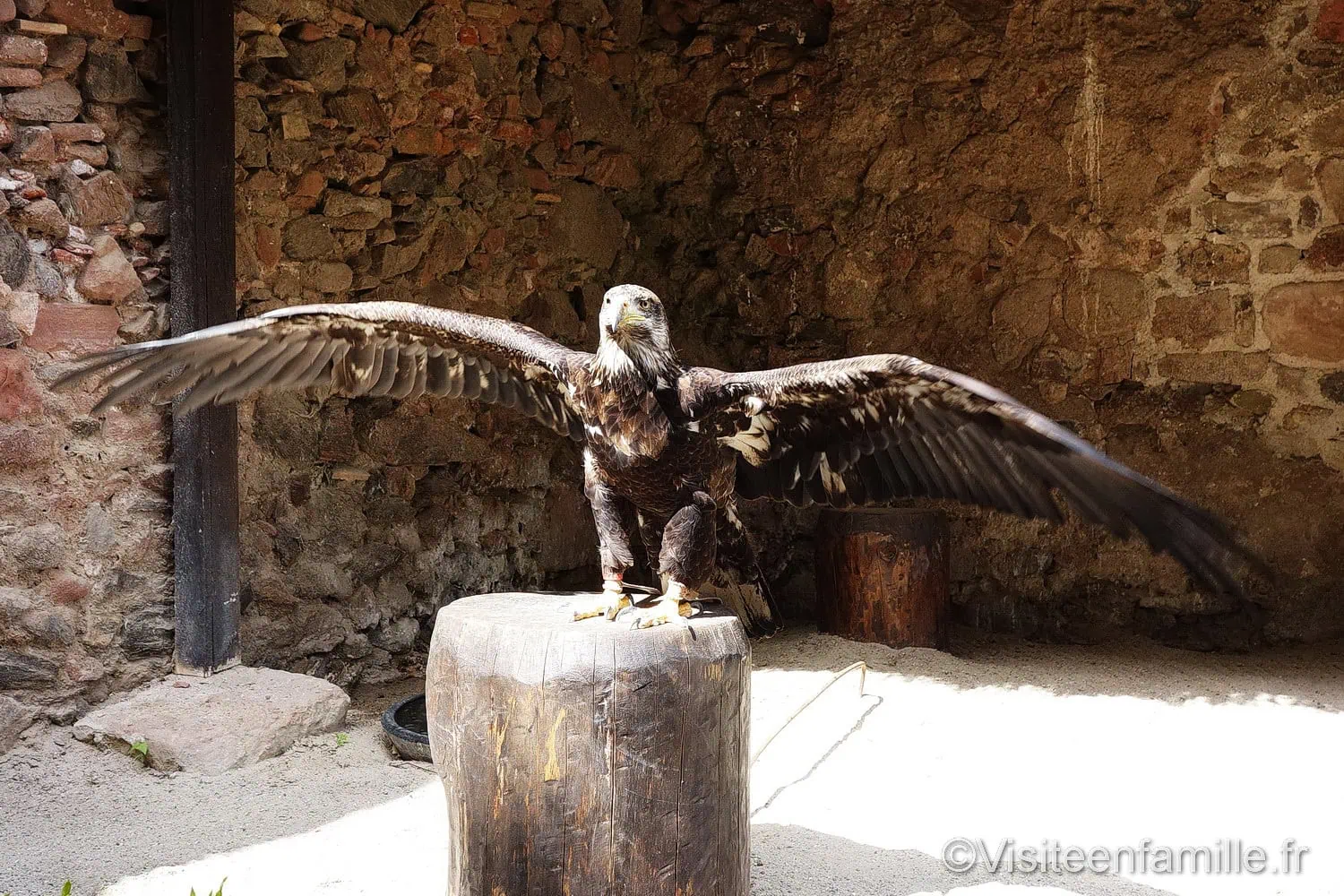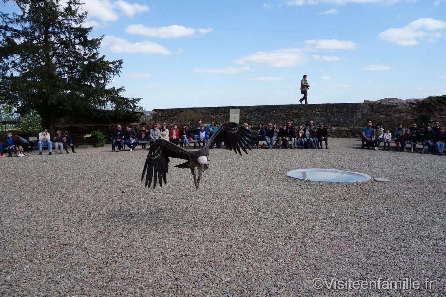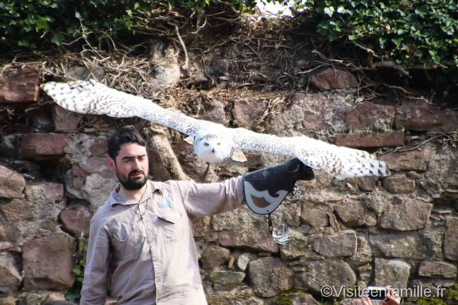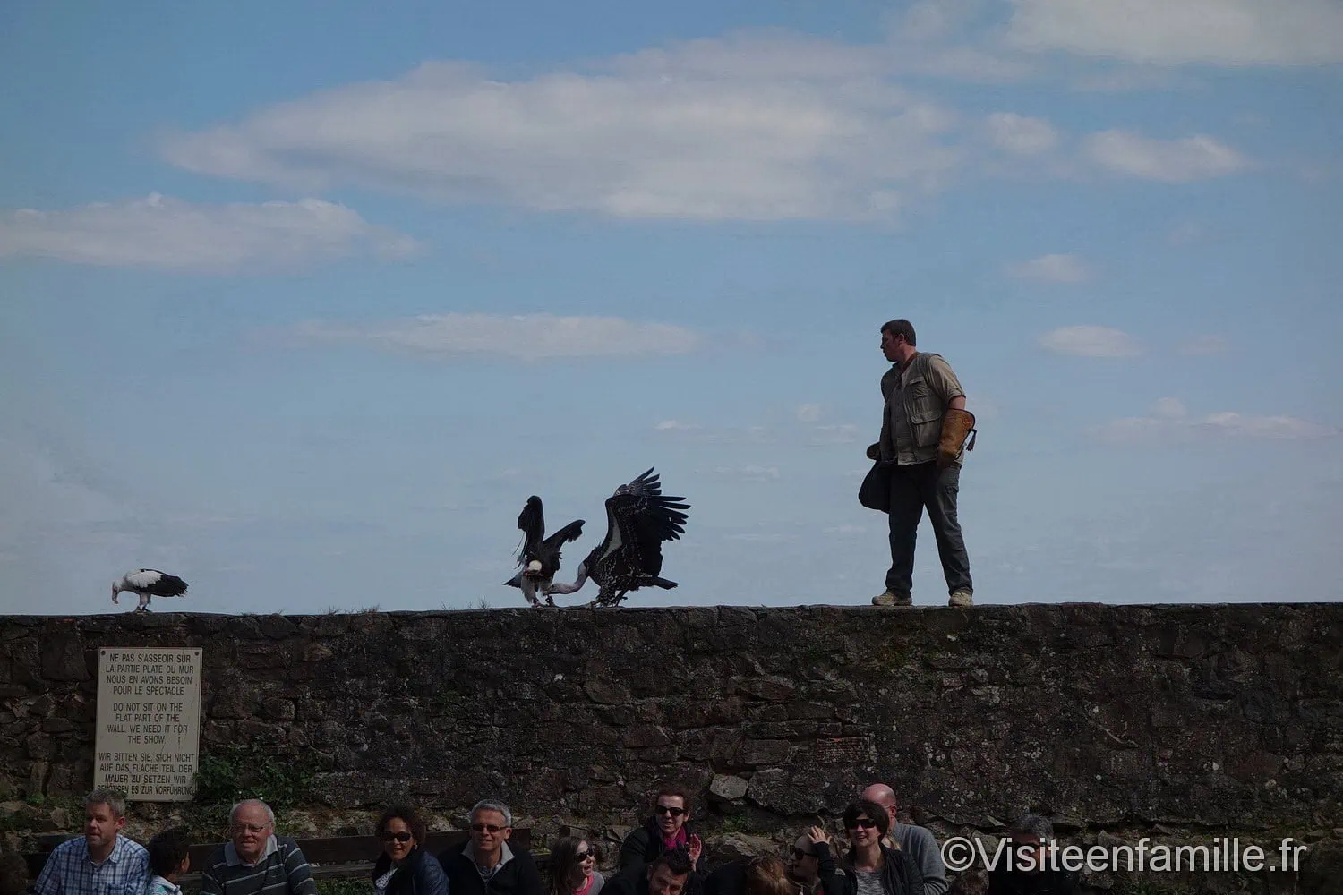 Accueil Ville/Région Alsace Rachel A Kintzheim, outre les singes et les cigognes, on peut également observer les rapaces, faucons, chouettes à la volerie des aigles, dans un décor médiéval. Des spectacles sont organisés pour le plus grand plaisir des spectateurs avec démonstration d’oiseaux de proie et démonstration de vol en toute liberté. Ce parc est situé dans les ruines du château de Kintzheim en Alsace. Tout d’abord, le parcours nous mène à observer de près tous les rapaces les uns après les autres. Certains sont dans des cages, d’autres attachés par les pattes à un piquet. Pour nous qui aimons les animaux, nous sommes peinés de voir ces géants des airs attachés à un piquet ou dans des cages. Néanmoins, les enfants aiment se retrouver dans ce château médiéval et assister au spectacle. Les dresseurs nous présentent toutes sortes de rapaces : des rapaces diurnes et des rapaces nocturnes comme les chouettes et hiboux. Ils nous donnent des explications claires sur la vie de ces oiseaux, de leurs habitudes. Le fait qu’un énorme rapace vole tout près des spectateurs est saisissant. On a toujours peur d’en recevoir un sur la tête ☺ À la fin du spectacle il est possible de caresser les oiseaux, voire d’en porter un et bien entendu de faire quelques beaux clichés avec eux Les dresseurs font, entre autres, des démonstrations avec des vautours percnoptères. Ces vautours mangent les œufs d’autruche. Pour cela, ils doivent casser les œufs avec une pierre (ici, il s’agit d’un œuf en sorte de plâtre, une imitation) mais la technique est efficace. On voit également une démonstration de chasse de l’aigle. Pour cela on utilise un faux lapin comme leurre. On voit également des démonstrations de chasse en vol. Les spectateurs admirent ainsi le ciel en quête de voir ces oiseaux furtifs. On pourra voir notamment le Pygargue de Steller qui est le plus grand aigle, ou encore la chouette lapone, le grand-duc, ou encore un Harfang des neiges (la chouette de Harry Potter), ainsi que des vautours. Certains jeunes en apprentissage ‘oublient’ de revenir au château et une équipe doit aller les chercher dans la vallée.Voir aussiNotre séjour au Center Parcs Les Trois Forêts Un parking gratuit est situé non loin du château. Il est également possible de se restaurer sur place. La visite, spectacle compris dure environ 1h30. Il faut compter environ 10 euros pour un billet adulte.